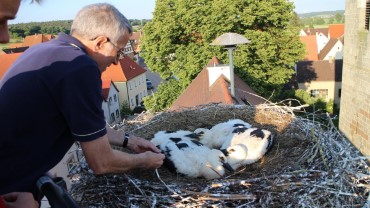Wie in den vergangen Jahren auch, war die Feuerwehr der Stadt Scheinfeld mit dem Drehleiterfahrzeug wieder beim Beringen des Storchennachwuchses in der Region behilflich.